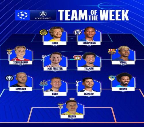 欧冠官方公布了联赛阶段第8轮的最佳阵容,战皇马破门的本菲卡门将特鲁宾入选,亚马尔在列。